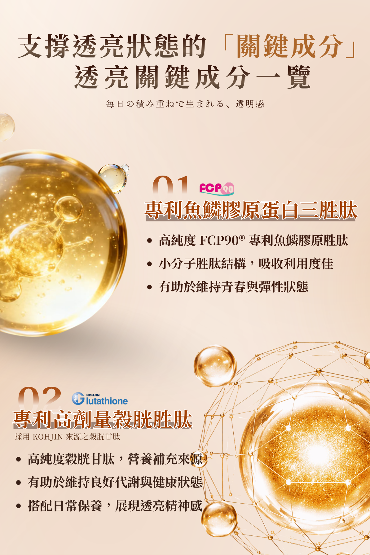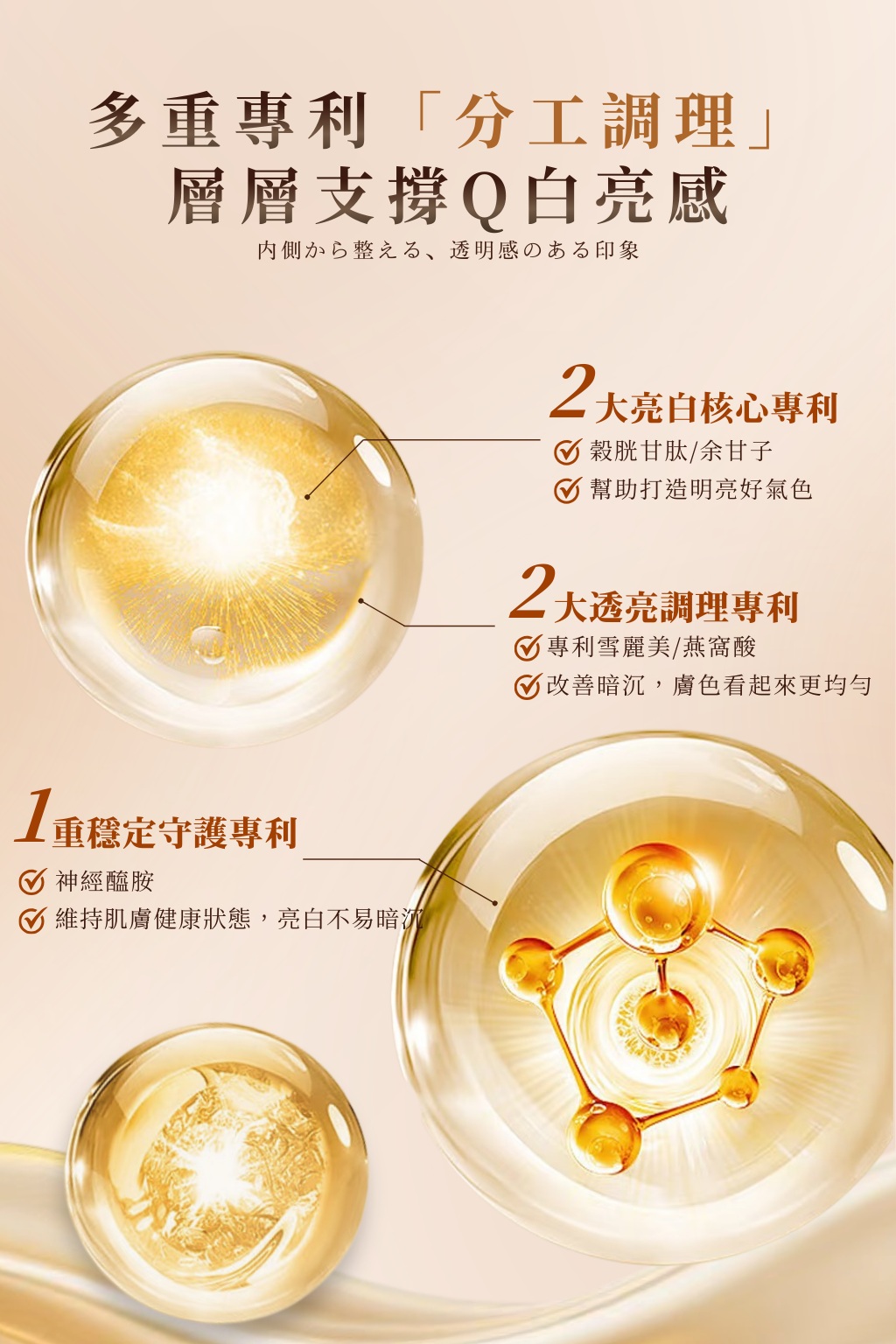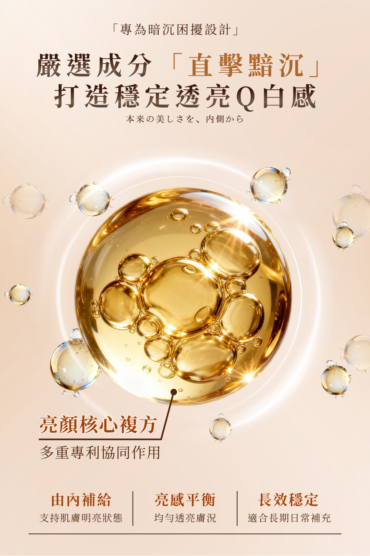 A:本產品以穀胱甘肽、膠原蛋白與多重維生素為基礎,協助對抗暗沉、維持肌膚明亮與健康狀態,從體內補充日常所需營養,支持肌膚由內而外的透亮感。